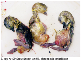 Megfigyeléseink szerint az előkeltetés viszonylag korai szakaszában megkezdett, naponta egyszeri hűtés megnövelte a ki nem kelt. De elő embriót tartalmazó tojások számát, a tojásokban az embriók a túlhűtés tipikus tüneteit mutatták: nyaködéma, a sziktömlő hiányos záródása, esetenként gyenge fejlettség (2. kép). A kelési eredmények, az első és az utolsó leszedés közötti különbség eredményei alapján az első hűtés időpontját addig toltuk későbbi időpontra, amikor már nem tapasztaltuk az előbb leírt jelenséget.