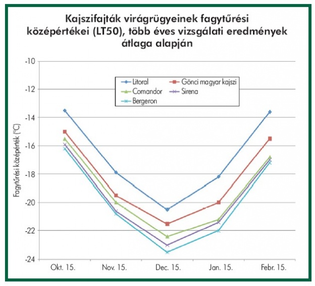 Mesterséges fagyasztásos kísérletekkel megvizsgáltuk áttelelő szerveik fagyállóságát. Több éves vizsgálati eredmények átlagait mutatjuk be az ábrán. A közepes fagy álló ságú Gönci magyar kajszi és a jó fagyállóságú Bergeron fajtákkal összehasonlítva ábrázoltuk a vizsgált fajták virágrügyeinek fagytűrési középértékeit, a tél különböző időpontjaiban. A Sirena és a Comandor fagyállósági értékei a két kontroll fajta értékei között voltak, közelebb a Bergero néhoz, tehát jó fagytűrők. A Litoral virágrügyei viszont a Gönci magyar kajsziénál fagyérzékenyebbnek bizonyultak, fagyveszélyes termőhelyre tehát nem való ez a fajta.