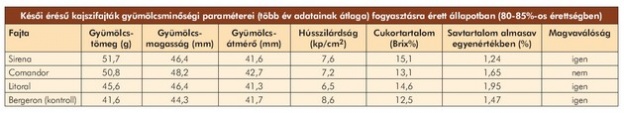 Legfontosabb gyümölcsminőségi jellemzőiket a táblázatban foglaltuk össze. Több éves vizsgálati eredményeink alapján az átlagos gyümölcsméreteket, a hússzilárdságot és a fő beltartalmi értékeket tüntettük föl a táblázatban friss fogyasztásra alkalmas érettségi állapotban, a szintén késői Bergeron fajtához viszonyítva. A gyümölcsátmérő alapján a Bergeronhoz hasonlóan az A méretkategóriába tartoznak a vizsgált fajták, de megnyúlt alakjuk és szép fedőszínük miatt ez friss piacra alkalmas minőséget jelent. Hússzilárdságuk 80-85%-os érettségben 7 kp/cm2 körüli, ami 0,5 cm2-es mérőfejjel vizsgálva 3,5-ös penetrométer-leolvasást jelent. Ez kissé rosszabb a Bergeron hússzilárdságánál, de jóval jobb, mint a Gönci magyar kajszié. Gyümölcseik cukortartalma magas, aromájuk és cukor–sav arányuk harmonikus, jó ízűek. A Litoral gyümölcsei az átlagosnál savasabbak, a Comandor hibája pedig, hogy maghoz kötött a gyümölcshúsa.