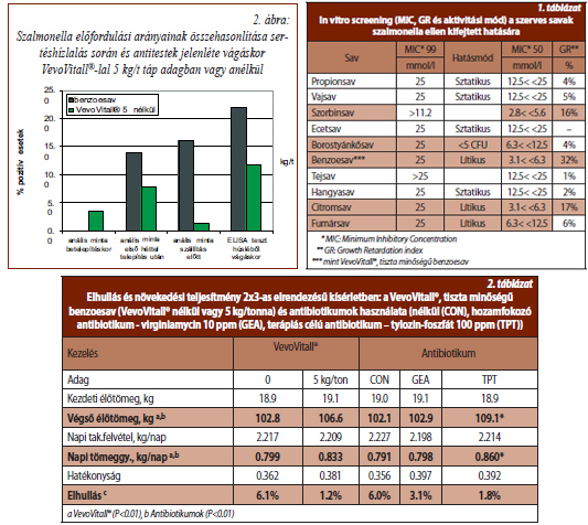 Szalmonellák esetében világosan bebizonyosodott, hogy in vitro és in vivo körülmények között is a VevoVitall®, az abszolút tiszta minőségű benzoesav, a leginkább hatékony készítmény a szerves savak közül, így közel olyan eredményeket mutat, mint a szalmonella elleni specifikus antibiotikumok.