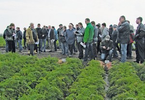 A kísérleti parcellákat június 29-én vetették 1,06 millió szemmel, bakhátba, és a bemutatót úgy szervezték, hogy 110-120 napos sárgarépákat láthasson a közönség – tudtuk meg Varga Istvántól, aki a kertészeti kultúrák termesztését irányítja a szövetkezetnél. A mikroszórófejes öntözésnek köszönhetően a keléssel nem voltak gondok, de az augusztusban ezt követő két, két és fél héten a harminc fokos talajt még a mikro öntözés sem tudta kellően lehűteni. A szakember ezzel együtt elfogadható, szép állománynak ítélte a kísérleti parcellákat.