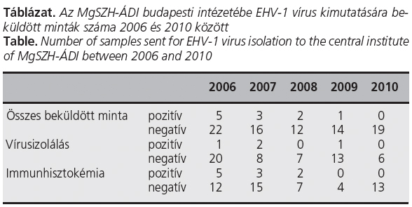 Az MgSZH-ÁDI-ba EHV-1-vizsgálatára beküldött klinikai minták kis száma azt sugallja, hogy a vírus által okozott fertőzések száma csekély, ezt a képet azonban a lópraxisban dolgozó kollégák beszámolói cáfolják. A lótartás egyre növekvő költségei mellett a diagnosztikai vizsgálatok árai is további terhet jelentenek, de az alapos diagnózis hozzásegítheti a tulajdonost és az állatorvost is, hogy elkerüljék az állományban a vírus reaktiválódását. A táblázatban a budapesti intézetbe víruskimutatásra beküldött minták száma látható évenkénti bontásban, 2006 és 2010 között. Az intézetben két vizsgálatot használtunk a rutindiagnosztikában az EHV-1 kimutatására, az egyik a vírusizolálás, a másik az immunhisztokémia. A két módszer érzékenysége közel azonos, azonban élő állatokból (pl. orrtamponokból) vírusizolálással lehet a kórokozót kimutatni.
