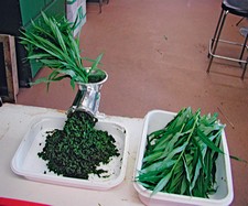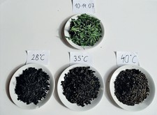 Moszkvai szakemberek a füzikelevél kézi sodorgatása helyett a közönséges húsdarálót ajánlották. Így minden növényi sejt összezúzódik, az enzimek működésbe lépnek és azonnal megkezdődik a fermentáció. A húsdarálóból kijövő növénymassza külsőleg a darált húsra emlékeztet, csak zöld és erősen kloro fillszagú. Szerettük volna megállapítani az optimális fermentációs hőmérsékletet és a folyamat időtartamát. Másrészt az esetleges ipari méretű feldolgozáshoz a levelek leválasztása nagyon költséges munkarész, így megvizsgáltuk azt is, hogyan hat a tea minőségére, ha nem tiszta levelet, hanem 30-40 cm hosszú leveles hajtásokat darálunk és fermentálunk. A zöld levélmaszszát fóliazacskókba vagy dobozokba helyeztük és 28-35-40 °C-os hőmérsékleten tartottuk. Néhány óra múltán a zöld növénymassza színe sötétedni kezd, a klorofillszag eltűnik, helyette kellemes, pipadohányra emlékeztető illatú lesz. Amikor a massza teljesen sötét dohánybarnára színeződött, és a pipadohány illat igen intenzívvé vált, a fermentálódott levélmasszát a szárító rácsán vékony rétegben elterítettük és néhány óra alatt 40 °Con megszárítottuk. A végeredményt – a fekete tealeveleket – a gombóckák szétzúzásával és rostálással kaptuk. A különböző hőfokon fermentált minták kémiai analízisét izgatottan várjuk.