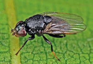 Lapunk idei 34. számában, a 22. oldalon olvasható, hogy a karan tén lis tán szereplő Rhagoletis completa előfordulása a környező országok után nálunk is bizonyítást nyert Kőszeg környékén. Budapest kertes körzetében a diófákon az új kártevő megjelenését vizsgálva, már hatodik éve rendszeresen megfigyelhető a zöld dió burkának jellegzetes károsítása. Okozója eddig mindig a Chloropidae, a gabonalegyek családjába tartozó Polyodaspis ruficornis, a fekete dióburoklégy volt. Ez a faj az egész eurázsiai földrészen elő fordul Finnországtól Mandzsúriáig, délen pedig a Földközi-tenger medencéje körül. Lárvája a dió zöld burkában él, de mogyoróból, kenderből, aszatok fészekvirágzatából is kinevelték. Szivarsodró eszelények (Byctiscus és Apoderus fajok) levélsodratában, és gyümölcsdarazsak (Hoplocampa fajok) lárváinak társaságában is észlelték, bomló szerves anyagokat fogyasztva. Esetenként a gyümölcsmolyok és a kukoricamoly külső élősködőjeként figyelték meg.