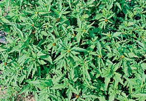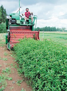 A nagy biomassza technológiai feladatot is jelentett. A trágyázott talajviszonyok között a növény 70-90 cm magasra is megnő, vastag szárat fejleszt, dúsan elágazik és a betakarított herbában igen magas az értéktelen szárrészek aránya. Ezt nagyobb növénysűrűséggel (helybevetés) és többszöri vágással lehet ellensúlyozni. A növények megújuló képessége akkor volt a legjobb, ha nem vágtuk le túl mélyen. A 15-20 cm magas tarló alsó rügyeiből gyorsan új hajtások fejlődtek. Dél-finnországi viszonyok között a május végén kipalántázott állományokat háromszor, a június elején helybevetetteket kétszer vághattuk géppel. Az így betakarított leveles herbában a szár aránya lényegesen kisebb, és megfelel az Orosz Gyógyszerkönyv előírásainak. A gépi betakarítást rendfelszedővel ellátott fűkaszával végeztük, igen könnyen.