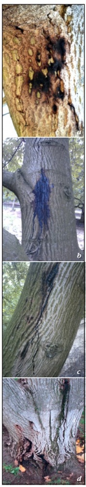 A Brenneria nigrifluens baktérium által kiváltott tünetekre jellemző a sekély, szabálytalan alakú fekélyesedés a törzs és az ágak kérgén. A fekélyes sebekből sötét folyadék szivárog a tenyészidő során. A kérget eltávolítva, egyes esetekben nekrózis is megfigyelhető, ami kiterjedhet a kambiumra és a xylémre. A betegségre utal a fa erőnlétének leromlása, a korai lombhullás és elöregedés, végül a fa elpusztul.