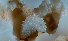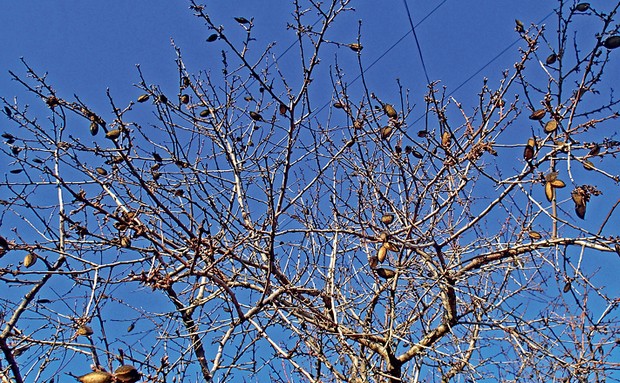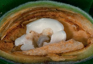 A korábban fertőzött mandulák a fán maradnak összeszáradva, a később károsított, már fejlettebb termések azonban lehullanak. A legtöbb lárva a vékony héjú mandulákban található, a vastagabb héjú és a keserű mandulák alig károsodnak. Június végétől, július elejétől a fejlődésüket befejezett lárvák a károsított termésben nyugalomban maradnak, majd áttelelés után márciusban bábozódnak.