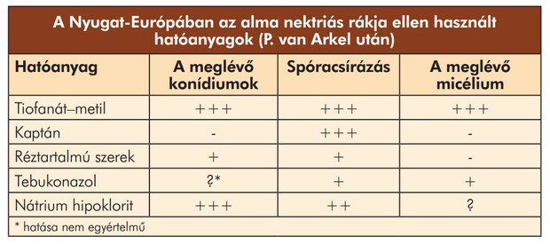 A táblázatból kitűnik, hogy e betegség ellen a tiofanán­metil (Topsin M 500) a leghatásosabb. Hollandiában hektáronkénti 2,25 literes adagban, Németországban 0,75 l/ha/1m famagasság dózisban engedélyezett erre a célra. Eredményesen fékezi a micélium fejlődését, a konídiumok képzését, csírázását. A csírázó spórákra hasonlóan hat a kaptán is, amelyik viszont nem olyan hatásos a micéliumfejlődés és a konídiumképzés megakadályozásában, mint a tiofanát­metil. Hollandiában bizonyították, hogy a tebukonazolrészben hatásos a csírázó spórák és a micélium ellen, a konídiumokra azonban nem egyértelmű a hatása. A nátrium­hipokloritis eredményesen fékezi a konídiumok képzését.