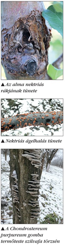 A Diaporthe perniciosa gomba az almatermésűeket és a csonthéjasokat támadja meg. Az elsődleges fertőzés konídiumokkal és aszkospó­rák kal történik a kéreg sebzé­sein keresztül, amelyen a ko­nídiumokat tartalmazó sötét piknídiumok láthatók. A fer­tőzés gyakori következménye az ágon vagy a törzsön bekö­vetkező gyűrűszerű elhalás. A fertőzött kéregrész besüpped és repedezik. A védekezés a fertőzött fák kivágásából, il­letve a beteg ágak eltávolításá­ból és elégetéséből áll. A vágá­si felületeket kezeljük Topsin M 500 2 százalékos oldatát tartalmazó diszperziós fes­tékkel vagy kertészeti sebke­zelővel. A metszést, a jégve­rést, illetve a szedést követő­en permetezzük a fákat az említett szerrel, illetve hason­ló hatásmódú készítménnyel.