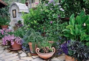 A kert jellegzetessége a lépcsős, teraszos elrendezés, és a veteményes-virágos váltakozás. A konyhakertben krumpli, hagyma, borsó, bab, saláta, paradicsom, paprika, padlizsán sorjázik takaros rendben a gyümölcsfák lábánál. A fűszerágyásokban tucatnyi aromás zöldfűszer: csombor, kapor, tárkony, lestyán, bazsalikom, oregánó, többféle menta.