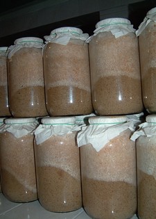 A benedvesített táptalajt 5 literes üvegekbe töltik, majd sterilizálás után kerül bele a gombaoltóanyag. Az üveget kilyukasztott lapkával lezárják,alyukonbújikmajdkia gomba.Az átszövető helyiségben a micélium fokozatosan feltárja a táptalajt, az üvegek csak a teljes átszövődés után kerülnek a termesztőhelyiségekbe.