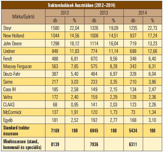 A 2014-es eladási listát is – mint a korábbiakat – a Steyr vezeti 22,7 százalékos piaci részesedéssel. A New Holland került a dobogó második helyére megelőzve, az előző két évben második John Deere-t. A Steyr mellett a másik osztrák (tiroli) traktorgyár a Lindner megőrizte a negyedik helyét és valamivel még növelte is a piaci részesedését (12,66%). A következő három pozícióban nagyon közeli eladott darabszámokkal és piaci részesedéssel egymást követi a Fendt, a Massey Ferguson és a Deutz-Fahr. Az utánuk következő négyek – Same, Case IH, Valtra és Claas – kevesebb eladott darabszám mellett növelni tudták a piaci részesedésüket. Gabonakombájnból tavaly 120 darabot adtak el az országban. Ezeknek 42,5 százaléka volt CLAAS, 30 százaléka New Holland és 13,3 százaléka pedig John Deere.