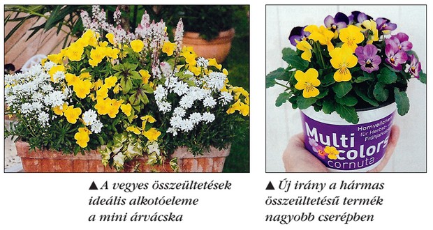 tápkockás értékesítést a növényházi cserepes (8-9 centiméter) termesztés váltotta fel, és szinte ezzel egy időben indult el a mini árvácskák (Viola cornuta) karrierje is. Ezzel – különösen a kora tavaszi értékesítési időszakban – megszűnt a nagy virágú Viola x wittrockianahibridek egyeduralma. Az árvácska népszerűségének és piaci sikerének fenntartásában, növelésében éppen ez lehet az egyik szempont, vélik a szakértők. A kissé „poros”, unalmas nagy virágúak mellett a minik frissek, fiatalosak, modernek, megnyerőbbek a fiatalabb közönség számára. A termesztők és az