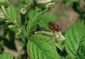 A málnaültetvényben találkozunk speciális és többgazdásmálnakárosítókkal éshasznos élő szervezetekkel is, például a vöröses mezei poloskával, amely levéltetvekkel táplálkozik, de kishernyókra isvadászik.