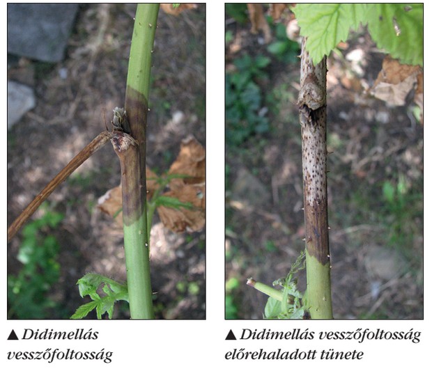 milliméteres hosszúkás, li láspiros, elmosódott szélű foltok láthatók. Később a foltok közepe kiszürkül, benne apró fekete pontok, a kórokozó termőtestei láthatók. A gomba csak a kérget károsítja, a fertőzés a beteg vesszőkről kerül a hajtásra. Réz-hidroxid-,réz-oxiklorid-tartalmú készítményeket használjunk a hajtásnövekedés időszakában.
