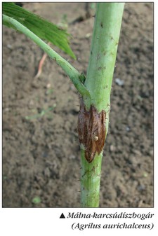 A málna-karcsú díszbogár (Agrilus aurichalceus)elsősorban a házikerti málnásokban károsít, de az árutermelő ültetvényekben is megtalálható, a vesszőkárosítás mértéke a 10-15 százalékot is elérheti. A narancssárga lárvák szívogatása nyomán 1-3 centiméteres gömbölyded repedezett felszínű gubacsok keletkeznek, amelyek korlátozzák a nedvkeringést, ezért a fölöttük lévő hajtás kevés tápanyagot kap, fonnyad, a termés apró lesz. A szüret után a gubacsok már jól láthatók, ekkor a károsodott vesszőkeltávolításával védekezhetünk a málna-karcsúdíszbogár ellen. A telelés lárva alakban történik, a bábozódásra a következő év tavaszán, hazánk viszonyai között április eleje és május eleje között kerül sor.