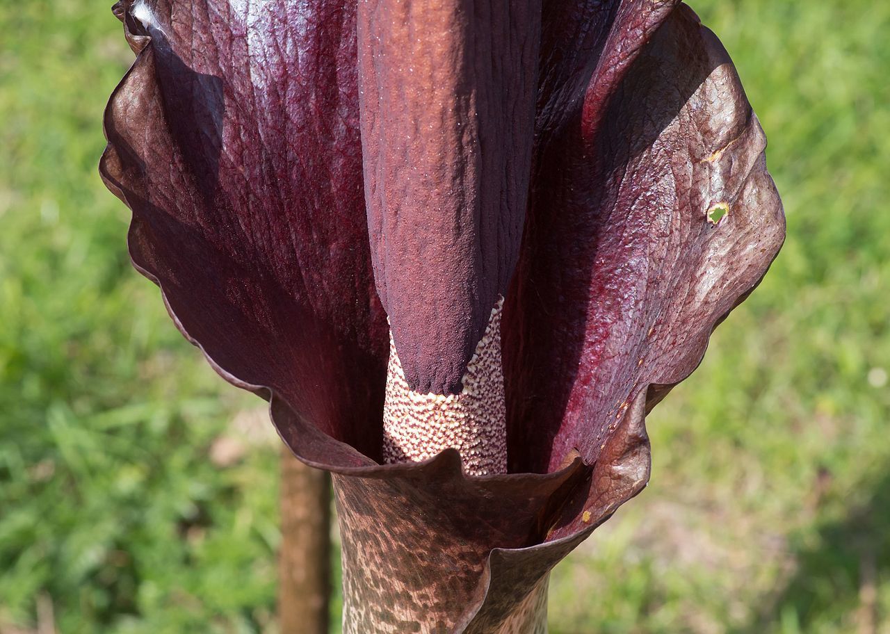A növényvilág e különlegességei a trópusi őserdőkben élnek. Egyik elhajló, másik álló lombú, mindkettő pálmaszerű kinézetű. Labdányi kopasz gumójából a tél vége felé egy csepp víz nélkül képes kihozni hatalmas vörösbarna, bizarr formájú, 1-1,5 m-es, kalászszerű virágát, amely szép formájú, nagyméretű, de kissé büdös. A fő látványossága pont ez, hogy minden föld, cserép vagy egyéb tartó nélkül hozza virágát. Tavasszal a kertbe kiültetve egyetlen hatalmas, csipkézett, pálmaszerű levelet növeszt, amelynek szára leopárdszerű barnás foltokkal tarkított, innen a leopárdpálma elnevezés.