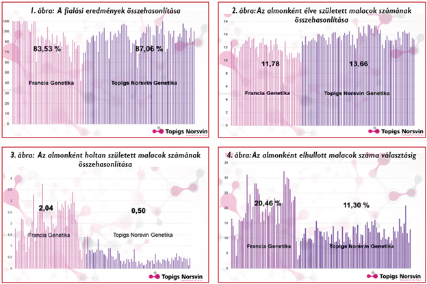 Az új Topigs Norsvin genetikával kapott eredményeket egy 360 hetes időszak vonatkozásában összehasonlították a francia genetikával kapott eredményekkel. Ezek igazolták a szakmai elvárásokat.