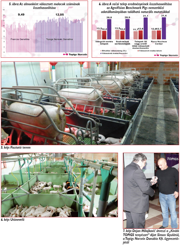A telepi eredményeket összevetették az AgroVision B.V. Deventer, Hollandia „AgroVision Benchmark Pigs” nemzetközi adatállományában található naturális mutatókkal. Az összehasonlítás a 2013. január 1 és december 31. közötti időszakra terjedt ki. A račai telep eredményeit az „Integrált sertéstelepek”, „Szakosított sertéstelepek” és az „Évenként és kocánként 30-nál több választott malacot előállító” telepek átlagos eredményeihez hasonlították (6. ábra).