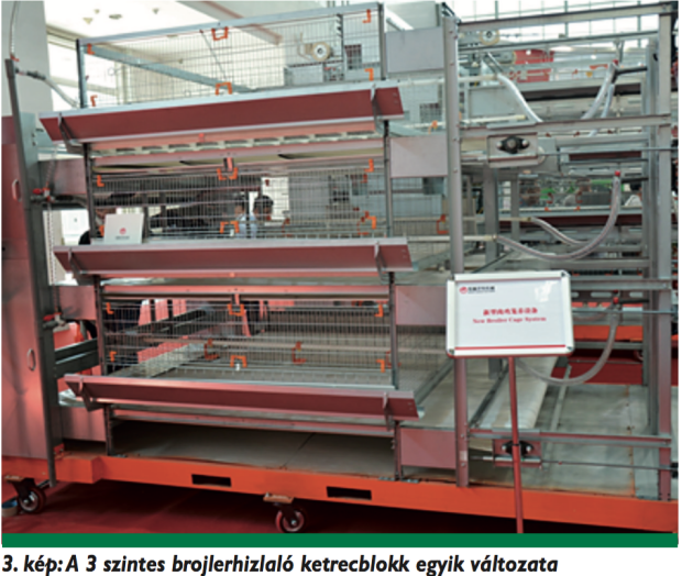 Meglepő módon többféle változatát mutatták be brojlerhizlaló ketrecrendszereknek, amelyek jellemzően háromszintesek voltak. A brojlerek hizlalásvégi kiszállítását a trágyaszalaggal oldják meg (3. kép). Az alternatív tartásrendszerek egyetlen változatával sem találkoztunk a kiállításon. Úgy tűnik, a termelés hatékonysága minden más követelményt felülír Kínában. Többször megfogalmazódott magánbeszélgetések keretében is, hogy a kínai agrárpolitika érdeklődésének homlokterében a lakosság lehető legszélesebb körének magas szintű állatifehérje-ellátásának biztosítása a cél, lehetőleg mindenki számára megfizethető árszínvonalon.