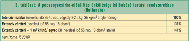 Általában az úgynevezett állatjólléti célú szabályozások kivétel nélkül megdrágítják mind a tojás-, mind a hústermelést. A brojlerekre vonatkozóan közöltek új adatokat hollandiai tapasztalatok alapján, minden üzem adatait összesítve (3. táblázat). Növekvő erőforrásigénnyel, nagyobb egységnyi termékre jutó környezeti lábnyommal kell számolni.