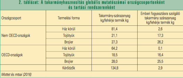 Figyelemre méltó összehasonlításokra ad lehetőséget, ha az intenzív tojó vagy hústípusú állományok egységnyi termékre (tiszta állati fehérjére) vetített takarmányhasznosítását vetjük össze az extenzíven tartott ház körüli (backyard) állományokéval abból a szemszögből, hogy azok mennyi emberi fogyasztásra közvetlenül is alkalmas takarmányt hasznosítanak (2. táblázat).