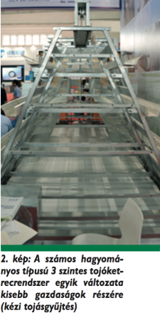 Feltűnő volt, hogy számos ketrecgyártó hagyományos típusú tojó- és nevelőketreceket gyárt, sok volt az akár 14 szintes konstrukció is (1. kép).Kisebb telepek részére többféle tojóketrectípust gyártanak, alapvetően kézi tojásgyűjtéssel. Egy ilyen megoldást mutat be a 2. kép.