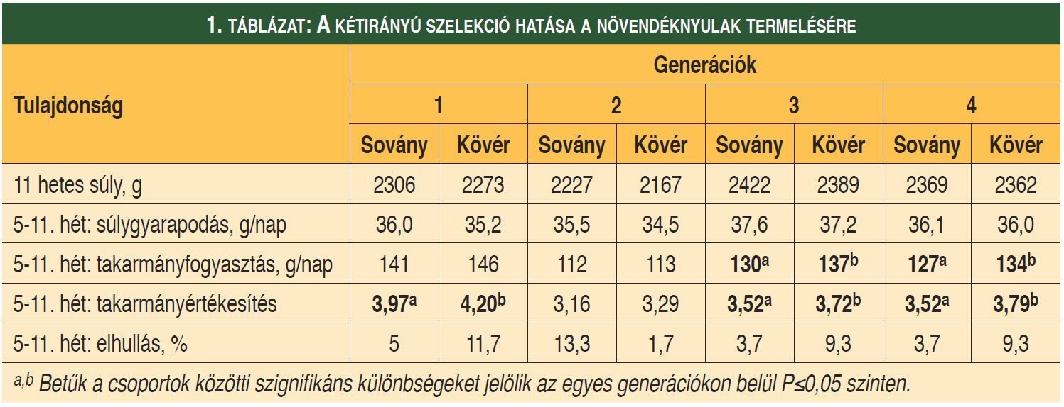 A növendéknyulakon több vizsgálatban igazoltuk a szelekciós munka hatékonyságát. Bár a Sovány nyulakban nem nagyon csökkent a zsírdepók mennyisége, de a Kövérekben kétszer több lett a vesekörüli zsír. Mivel a zsír beépüléséhez kb. négyszer annyi energiára van szükség, mint a fehérje beépüléséhez, a Kövér nyulak azonos súlygyarapodás eléréséhez több takarmányt fogyasztottak, és romlott a takarmányértékesítésük (1. táblázat). Megállapítottuk azt is, hogy nemcsak a zsírdepók, hanem a különböző testrészekről származó húsminták zsírtartalma között is különbség alakult ki, ami különösen a nagyobb zsírtartalmú húsmintákban volt jelentős.