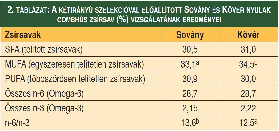 A Padovai Egyetemről érkezett PhD hallgató mutatta be a húsminták zsírsavanalízisének eredményeit. Mindegyik generációból 15 Sovány és 15 Kövér csoportból hosszúhátizom-, comb-, elülsőláb- és hasfalmintát vizsgáltak meg laboratóriumban. A szelekció befolyásolta a zsírsavprofilt (2. táblázat). A Kövér csoportban mind a négy húsmintában nőtt a MUFA (egyszeresen telítetlen zsírsavak), és kedvezőbben alakult az n-6/n-3 (Omega-6/Omega-3) arány, ami egészségmegőrző szerepe miatt fontos lehet.