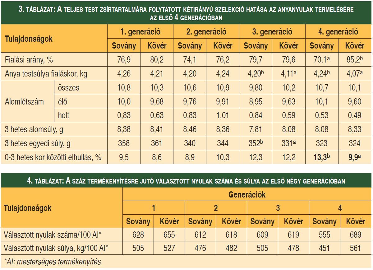 Az előzetes várakozással szemben az eddigi vizsgálatokban nem volt különbség a Sovány és a Kövér anyanyulak termelése között. A 4. generációban viszont 15 százalékkal jobban vemhesültek a Kövér, mint a Sovány nyulak (3. táblázat). Ennek oka az lehet, hogy amíg eddig 19 hetes életkorban, most 16,5 hetesen vettük tenyésztésbe az anyanyulakat. Úgy látszik, hogy idősebb korban a Sovány nyulak is elég jó kondícióban voltak, emiatt nem kellett számolni azzal, amivel fiatalabb korban, vagyis nem volt szükségük többletenergiára testsúlyuk növelésére, mert 19 hetesen már kellően kifejlettek voltak. Mivel a CT adatok alapján a testzsírtartalomra végzett kétirányú szelekció hatására jelentősen megváltozott a vesekörüli zsír aránya, ezért a testsúlyban tapasztalt eltérés ellentétes a korábbi irodalmi eredményekkel, miszerint a nagyobb vesekörüli zsírral rendelkező anyanyulak fialáskor nehezebbek, mint a kisebb zsírtartalékokkal rendelkező egyedek. Alomlétszámban, 3 hetes alom- és egyedi súlyban, valamint elhullásban inkább véletlenszerűen alakult a két csoport közötti különbség.