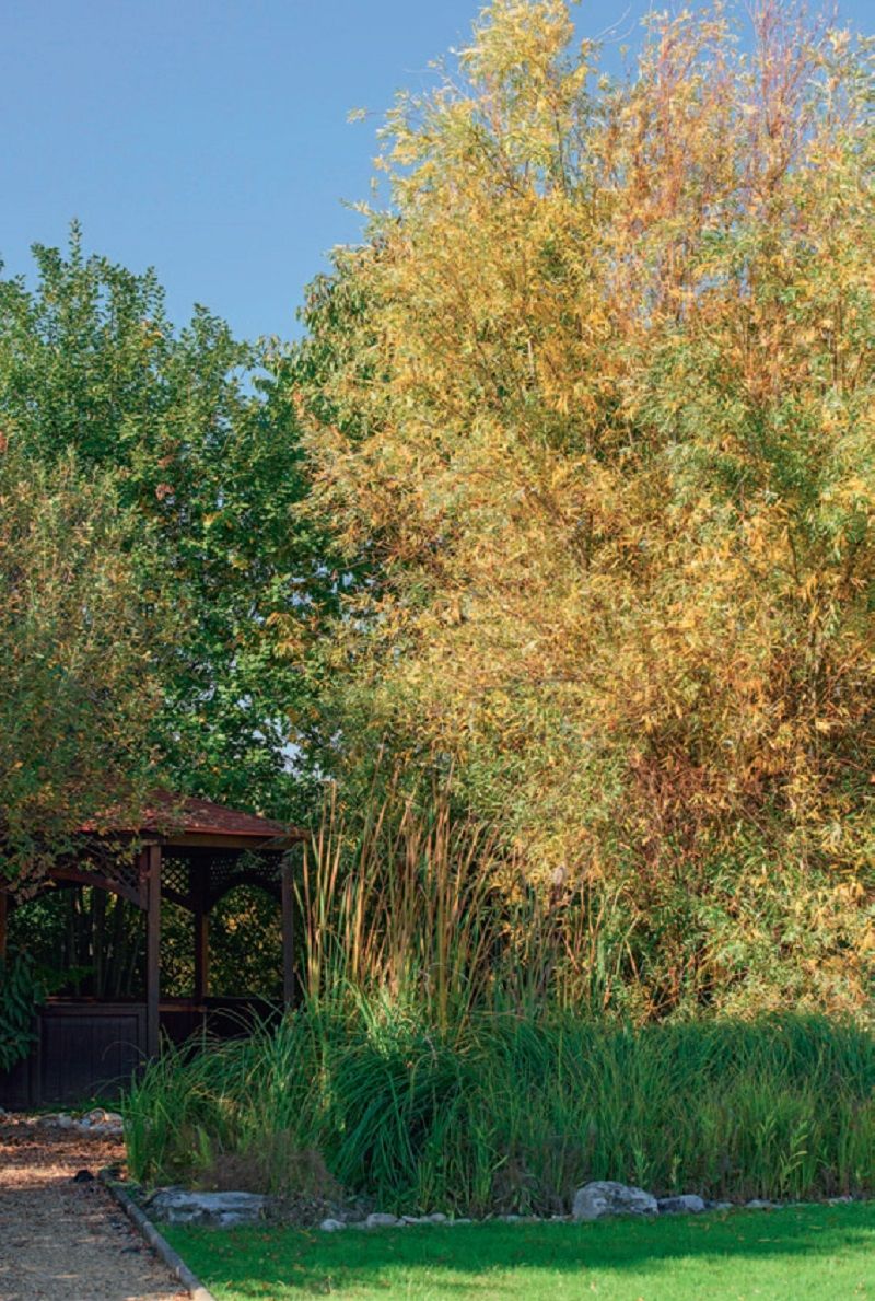 – Ebbe a kertbe úgy vannak a cserjék, évelő virágok elültetve, hogy mindig virágozzon, díszítsen valami. Tavasztól késő őszig színes. Rengeteg kisebb-nagyobb növény él itt, soknak a nevét se tudom. Kedvenceim a fák: a gyönyörű vöröstölgy, a formás hárs, az oszlopos gyertyán, a platán. Van két fiatal cédrus, ami akár ötszáz évig is elélhet, hatalmasra meg tud nőni. Úgy ültettük őket, hogy a teraszon ülő vendégek a két fa között épp a hegyet látják.