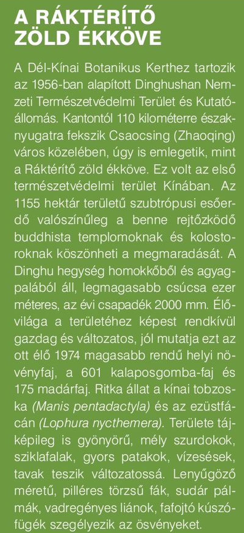 Első két alkalommal a kert közepén lévő vendégházban laktam, így volt lehetőségem az esti csendes kertben is sétálni. A szubtrópusi színeket és illatokat, az éjszakai különleges hangokat most is föl tudom idézni. Kína az elmúlt 30 évben leírhatatlan és drámai változásokon ment keresztül nem feltétlenül a legjobb irányban, a kantoni botanikus kert csodája azonban változatlan maradt.
