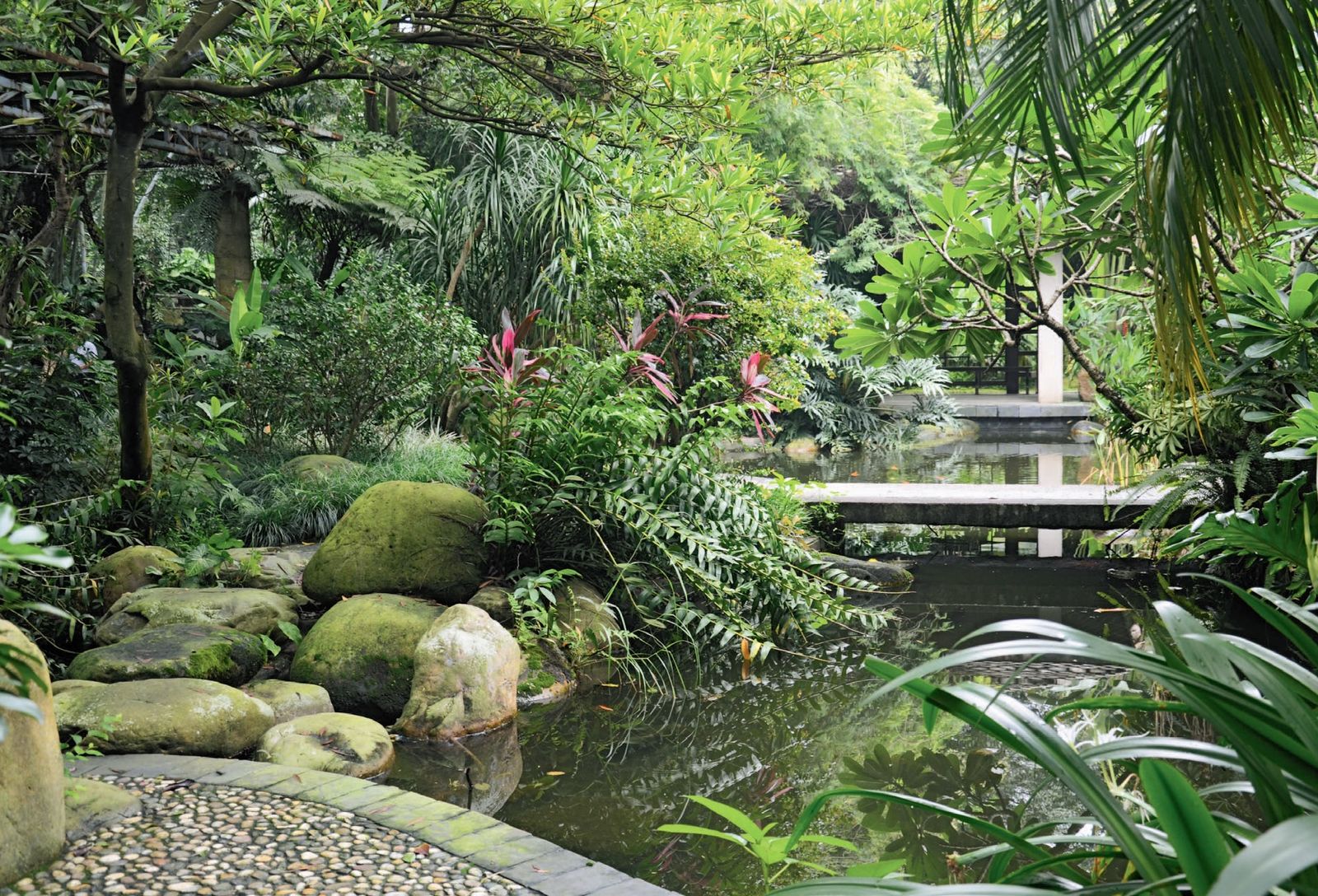 Figyelemre méltó közülük a rendkívül gazdag pálma-, cikász-, bambusz-, gyógynövény-, haszonnövény-, bonsai-, kamélia-, magnólia- és gyömbérfélegyűjtemény, amelyek szabadföldön tekinthetők meg külön-külön kertrészekben. Különösen izgalmas a hagyományos kínai gyógyászatban használatos fajokat nagy számban bemutató gyógynövénykert.
