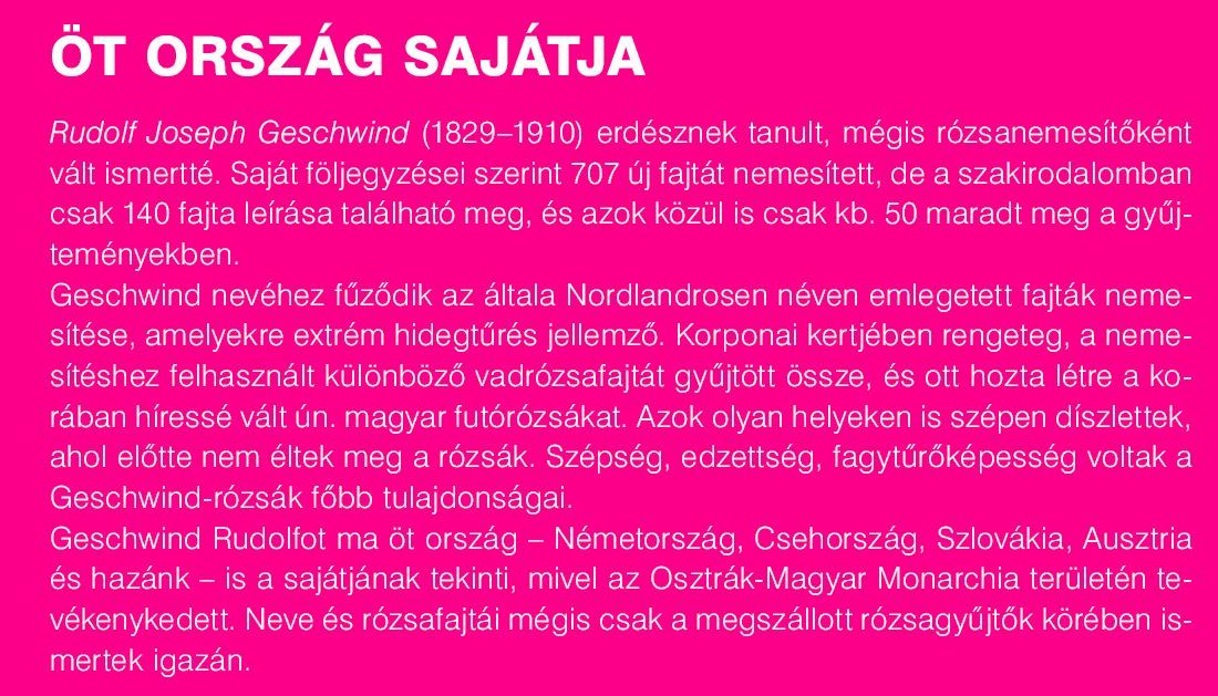 – Mert nagyon különlegesek. Ami az előnyük, az a hátrányuk is egyben. Nagy térigényűek, ezért nem valók kis kertekbe, de nekem itt van helyem bőven a számukra. Sokuk sajnos csak egyszer virágzik, viszont nagyon jól tűrik a hideget, ami a nemesítésüknél is az egyik fő szempont volt. Geschwind Rudolf Korponán (a mai Szlovákia területén) volt főerdész. Amatőr rózsanemesítőként kezdte, végül Európa- szerte ismert, nemzetközileg jelentős nemesítő vált belőle. Nemesítéseihez főleg vadrózsafajokat használt, ami forradalmi újítás volt a maga idejében. Jó lenne, ha a hazai rózsakedvelők is megismernék tevékenységét, fajtáit. Mintegy 700 fajtát nemesített, amikből név nélkül más nemesítőknek is eladott. Jelenleg 64 még meglévő fajtája ismert, de néhányat más nemesítő nevén jegyeztek be. Nagy részük termetes, nagy helyigényű bokrot nevel, és egyszer, a nyár elején nyílik. Akkor viszont pazar a látvány. Többeket elriaszt, ha egy rózsa csak egyszer nyílik, de gondoljunk csak bele: a virágzó cserjék, például a gyöngyvesszők, az orgona, az aranycserje is csak évenként egyszer virágzik, mégis ott vannak szinte minden kertben.