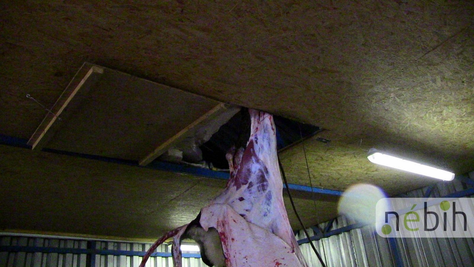 A helyiségben kiépített, billenő ajtóval eltakarható csörlőt és az aljzat betonban rögzített fém karikát találtak. Természetesen – az engedély hiányán túl – ezek a körülmények nem feleltek meg sem az állatvédelmi, sem az élelmiszer-higiéniai előírásoknak. Az épp levágott szarvasmarha ráadásul kísérő dokumentumok, azaz a származását bizonyító iratok nélkül került az egységbe.