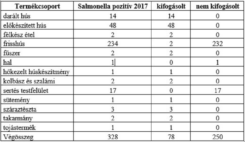 A szalmonella jelenléte miatt kifogásolt termékek többsége az előkészített hús (48 tétel) és a darált hús (14 tétel) termékcsoportokba tartozott. Emellett friss baromfihús, félkész étel, kolbász és fűszer esetében 2-2, száraztészta esetében 3, tojástermék, hőkezelt húskészítmény és sütemény esetében 1-1 tétel szalmonella fertőzöttsége miatt kellett a hatóságnak eljárni.