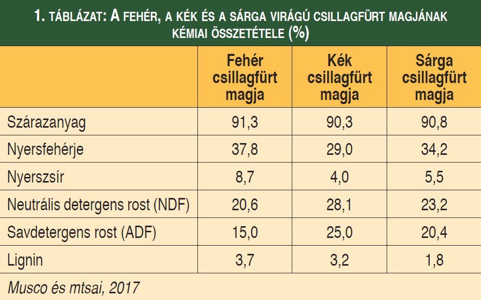 A csillagfürtmagnak magas a fehérjetartalma (33-47%). Ezen belül alacsony a metionin, a cisztin és a lizin, és magas az arginin tartalma. A keményítőtartalom elhanyagolható. Az olajtartalom 6-13% között változik. Gazdag telítetlen zsírsavakban, különösen magas a C18:1 n-9, C18:2 n-6 és C18:3 n-3 tartalma. A három általánosan etetett csillagfürt kémiai összetétele az 1. táblázatban látható.