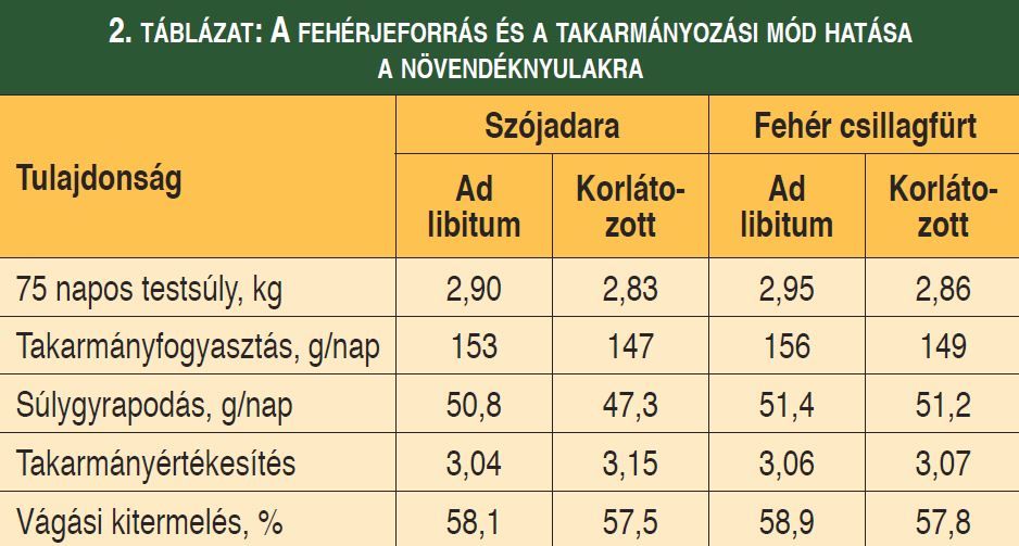 A következő kísérletben a fehérjeforrás és a takarmányozási mód kombinációját vizsgálták. Az egyik csoport takarmányába 7% szójadara, a másikéba 10,5% fehér csillagfürtmagdara lett bekeverve. Mindkét csoporton belül két alcsoportot alakítottak ki. Egyikben a nyulakat ad libitum takarmányozták, a másikban a 33 napos elválasztást követő két héten az ad libitum fogyasztás 75%-ának megfelelő mennyiségű takarmányt kaptak az állatok, majd a kísérlet végéig (75 napos korig) tetszés szerint ehettek. A takarmány nem befolyásolta a növendéknyulak termelését, de a korlátozás időszaka alatt kisebb volt a nyulak súlygyarapodása és a testsúlya. Ugyanakkor a teljes nevelési időszak alatt, 33- 75 nap között csak a takarmányfogyasztás és a testsúly, valamint a vágási kitermelés csökkent szignifikánsan (2. táblázat).