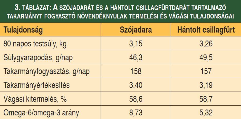 A hántolt fehér csillagfürtmag takarmányba keverését is kipróbálták. A hántolás miatt javult a csillagfürt táplálóértéke, nőtt a fehérje- és csökkent a rosttartalma. Az anyanyulak termelését nem befolyásolta, ugyanakkor a tej zsírsavösszetétele javult. A növendéknyulak takarmányába 7% szójadarát vagy 7% hántolt fehér csillagfürtmagdarát kevertek. A hántolt csillagfürtöt kapó nyulaknak javult a súlygyarapodása és takarmányértékesítése, és nőtt a testsúlya (3. táblázat).