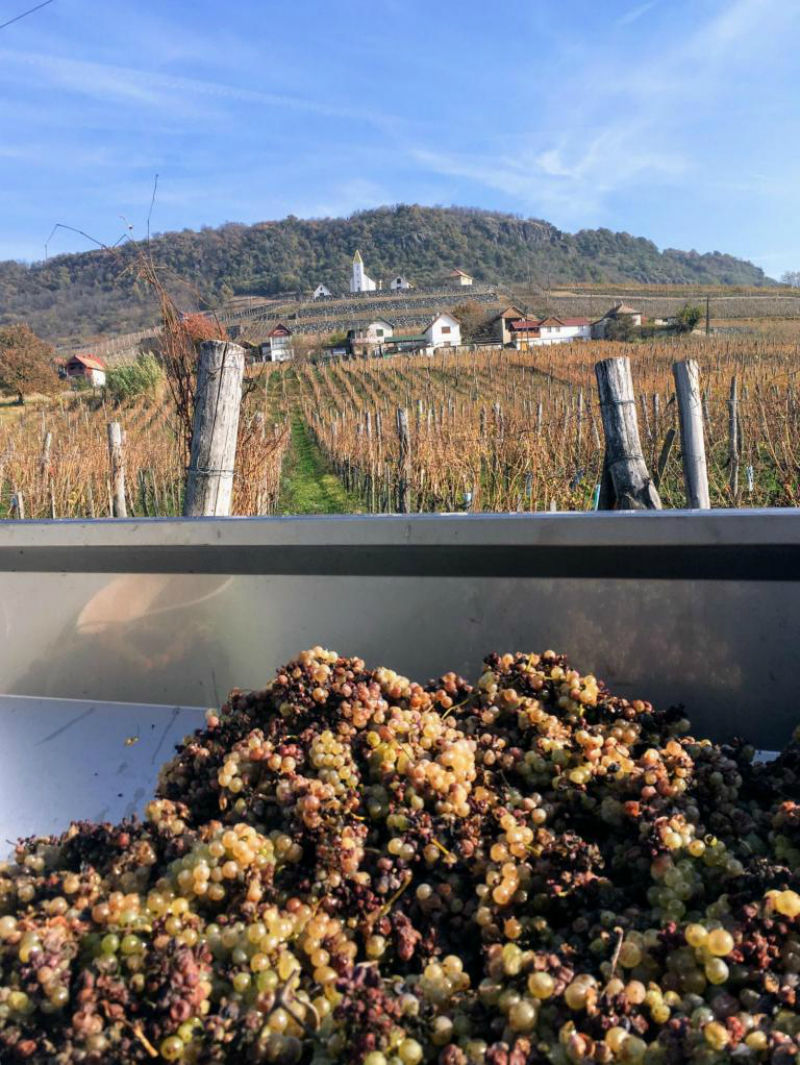 A családi pincészetnél olaszrizling, juhfark és hárslevelű szőlőből is hagytak fent fürtöket a szüret után a hegy Szent Ilona nevű dűlőjében.