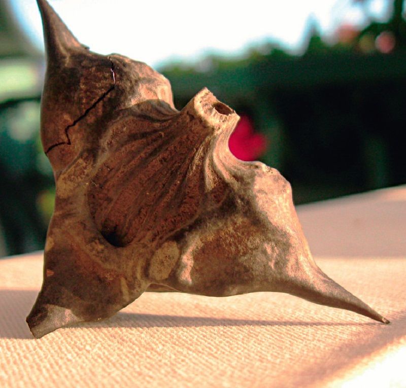A termése a levélzet alatt fejlődik, szeptemberre feketére érik be. 2-4 hegyes szarvat, a csúcsán pedig koronát visel, a magbele fehér.