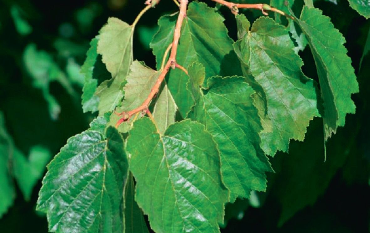 8-12 centiméteres, széles-tojásdad, szürkészöld, fényes, fűrészes szélű levelei késő ősszel sárgára színeződnek. Csüngő hímivarú barkái már február végén láthatók az ágakon, nőivarú rózsaszín virágai aprók, alig észrevehetők.