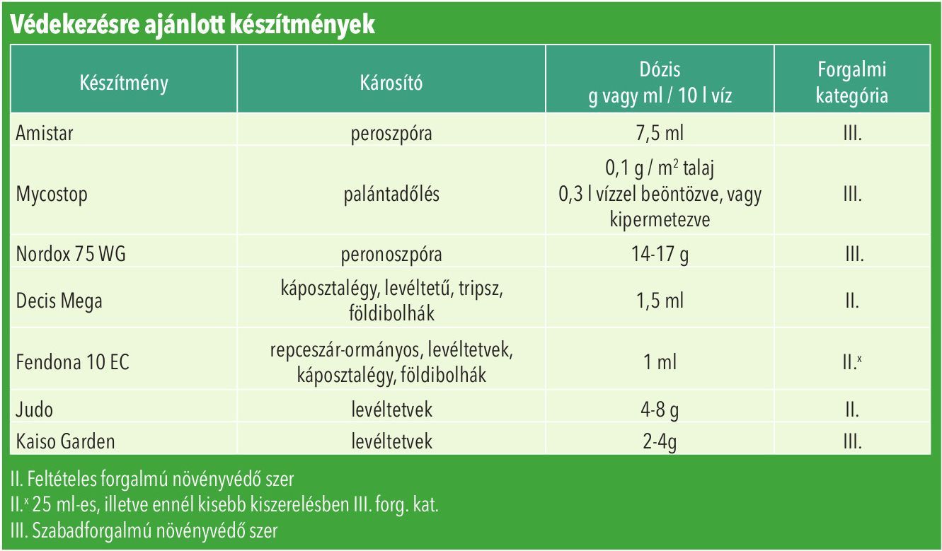 Figyelem!A karalábéban kevés engedélyezett növényvédő szer áll rendelkezésre, de szükség esetén az egyéb káposztafélékben engedélyezett szerek valamelyikére „szükséghelyzeti engedély” kérhető a hatóságtól. |