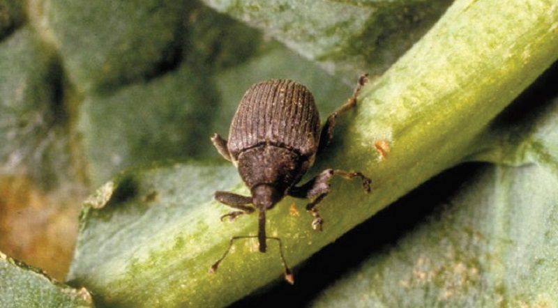 A kártevő 3-4 mm nagyságú, sötétszürke ormányosbogár. Könnyen felismerhető a hátán lévő fehér foltról. Évente egy nemzedéke fejlődik, imágói az avarban telelnek.