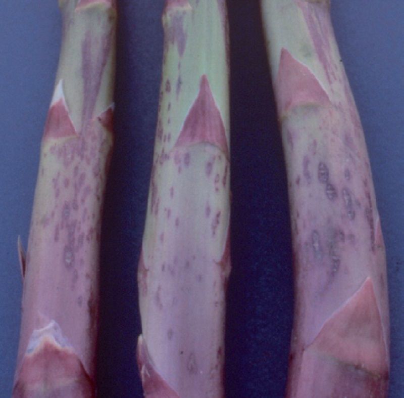 A spárgasípok vörösfoltossága esetén a sípok felületén elszórtan vörhenyes elszíneződés, vagy szabálytalan alakú vörösesbarna foltok jelennek meg. A vörhenyes elszíneződés előidézője a magas vastartalmú, nedves, nagy humusztartalmú talaj.