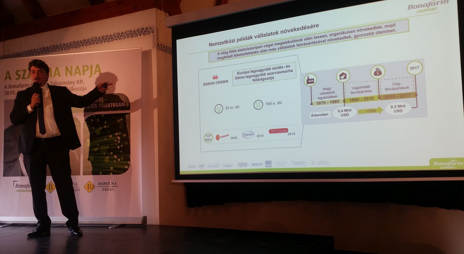 Csányi Attila, a Bonafarm Zrt. vezérigazgatója a Bonafarm Csoport akvizíciós szempontjairól beszélt, értékelte a jelenlegi helyzetet. Hangsúlyozta, hogy akvizícióik során nem olyan cégeket vettek, ahol ne lett volna feladat, akár a Pick esetében, ahol vágóhidat kellett építeni, vagy legutóbb, a Hungerit esetében, ahol szintén fejlesztésekre lesz szükség. Felhívta a jelenlévő partnerek figyelmét, hogy ne tekintsenek a Bonafarmra vevőként, mert nem terveznek akvizíciót. Inkább ha van például egy sertéstenyésztő gazdaság, amit fejlesztenének, maradjanak partnerek, és a Bonafarm segítséget nyújt, valamint garanciát ad arra is, hogy átveszi a sertést – ez mindkét félnek jó, jobb, mint egy adásvétel.