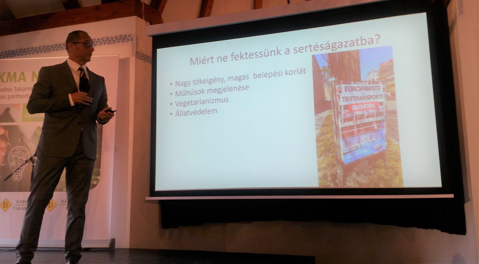 S. Nagy Csaba, az Agrogáz Kft. tulajdonos-ügyvezetője családi vállalati szemszögből, a saját példáján keresztül beszélt befektetési és bővítési stratégiáról a sertéságazatban. Azt mondta, hogy a kockázatkezelés tulajdonképpen egy felnőtt monopoly, és azt tanácsolta a jelenlévőknek, hogy ha például sertéstelepet vásárolnának, a professzionális vállalatértékelés mellett vegyenek igénybe mást is: a saját intuíciójukat. Ezek után bemutatta, hogy miért nem érdemes a sertéságazatba befektetni, és az ellenkezőjét is: vagyis azt, hogy pont ugyanazokért, amiket előzőleg hátrányként sorolt fel, azok előnyök is lehetnek.