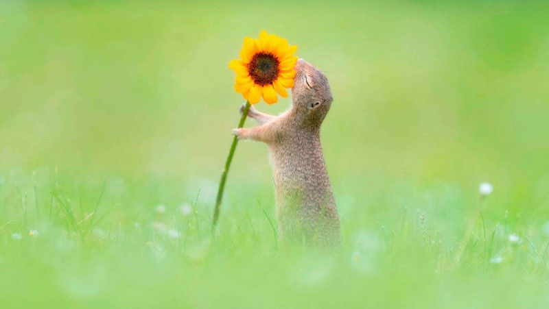 Renato Just fotós Bécsben sétált, amikor észrevett egy kisemlőst hátsó lábain ágaskodva, a virágszirmokat arcához húzva – számolt be a fénykép megszületéséről az SWNS brit hírügynökség.