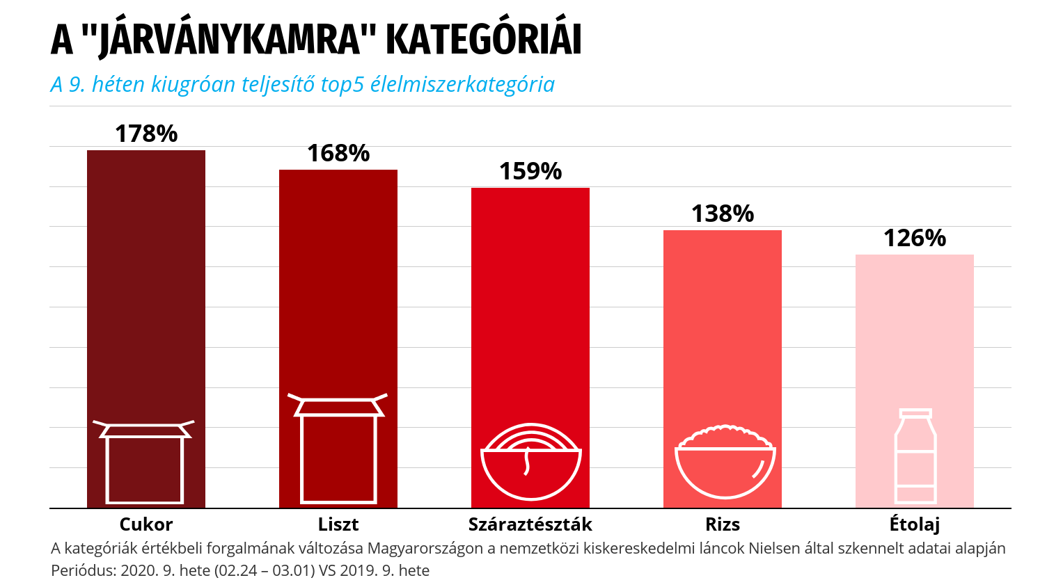 A fogyasztók megkezdték az alapvető termékek beraktározását: a Nielsen adataiból kiviláglik, hogy a nemzetközi kereskedelmi láncokban 2020 kilencedik hetében a cukor értékbeli forgalma 178%-kal ugrott meg az előző év azonos időszakához képest. A liszt értékesítése 168%-kal nőtt, de nagy tételben vásároltak száraztésztából, rizsből és étolajból is.
