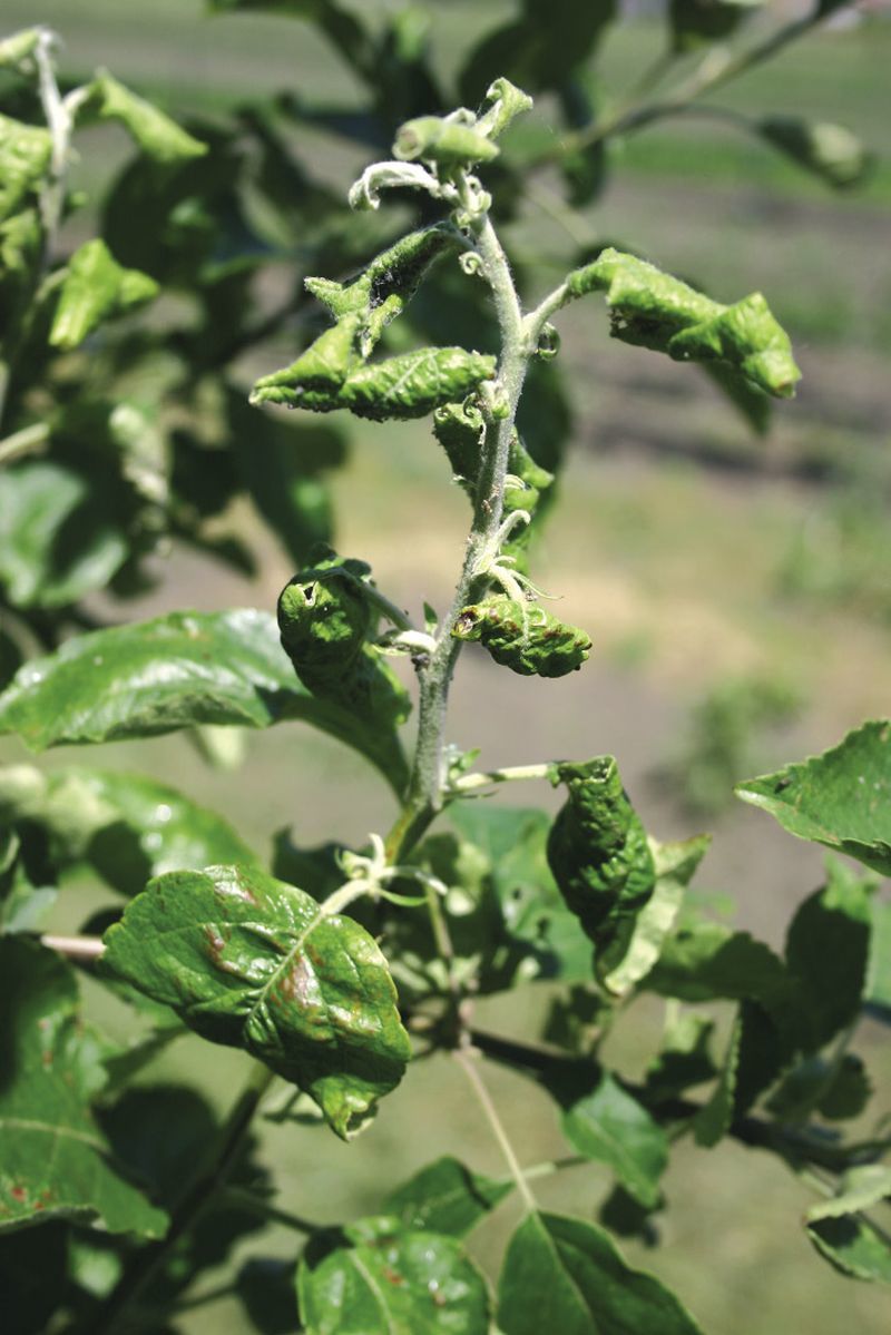 A meleg, párás idő kedvez a piros gyümölcsfa-takácsatka elszaporodásának. Ez a kártevő is tojás alakban telel a vastagabb ágrészeken, piros tojásai jól fölismerhetők. Az első nemzedék már pirosbimbós állapotban szívogat az almafa levelein. Az áttelelő tojások ellen olajos lemosópermetezéssel hatékonyan védekezhetünk. Három levéltetűfaj is megtámadja az almát, a zöld, a levélpirosító és a szürke alma-levéltetű. Mindegyik tojással telel, és ezért az olajos lemosás ellenük is védelmet nyújt.
